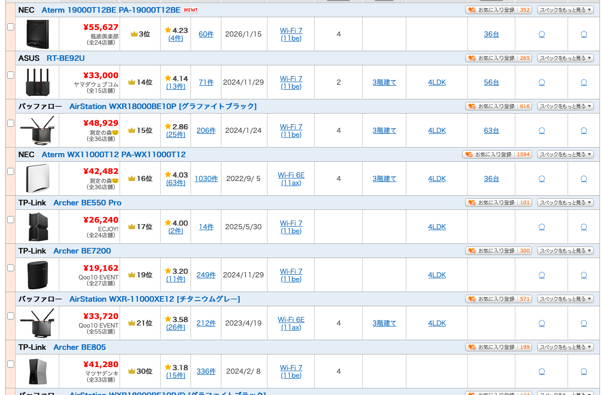 僕はこうした通信機器を選ぶ際は、まず価格.comを見ます。特にランキングや特定の機能に絞って検索することをよくやります。今回は10G対応ルーターを買いたいので、10G対応という条件のみでフィルタリングしてみました。実家暮らしの時代にはBuffaloを使っていて熱暴走を体験しました。コレガやプラネックスなどのBuffaloよりも低価格なルーターも試して、思った以上に動作が不安定だったことも良い思い出です。NECのAtermに総乗り換えしたこともありましたが、1年くらい使用してトラフィック過多で壊れました。最終的にたどり着いたのがASUSですが、10年使っていくうちに調子が悪くなりました。