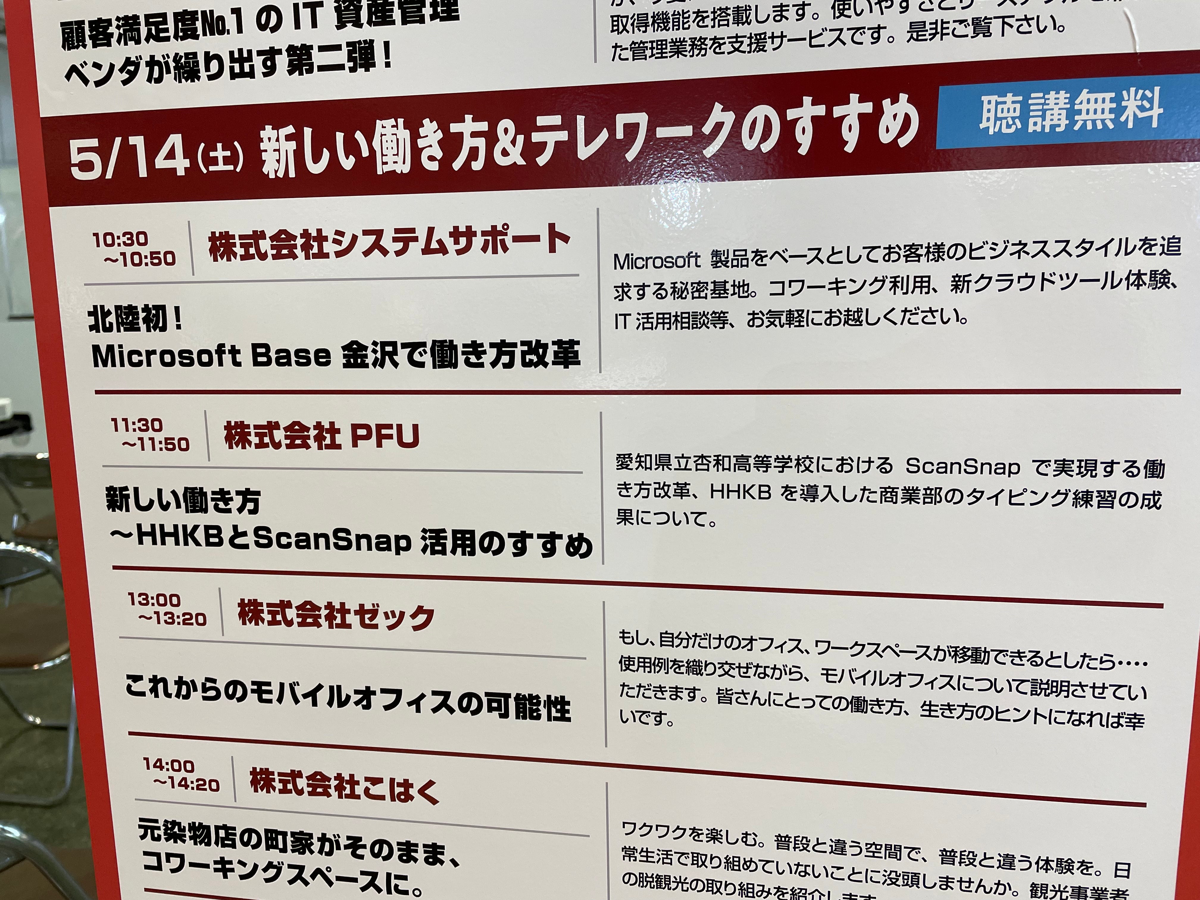 今回の講演は写真にあるパネルの通り3回行われました。でもこれはPFUブースでの話で、少し離れた場所にある企業プレゼンブースでも11時30分に同じ話をしました。 企業ブースでの講演は全ての椅子が埋まって満席状態でした。良かった良かった。