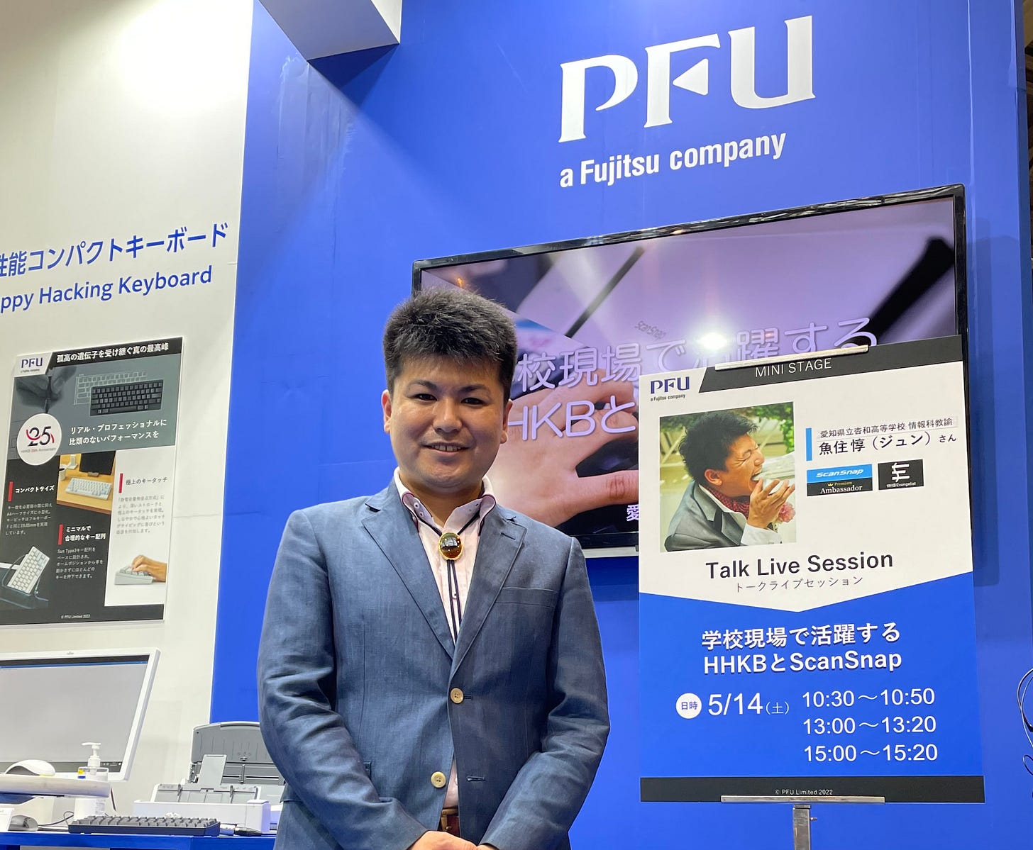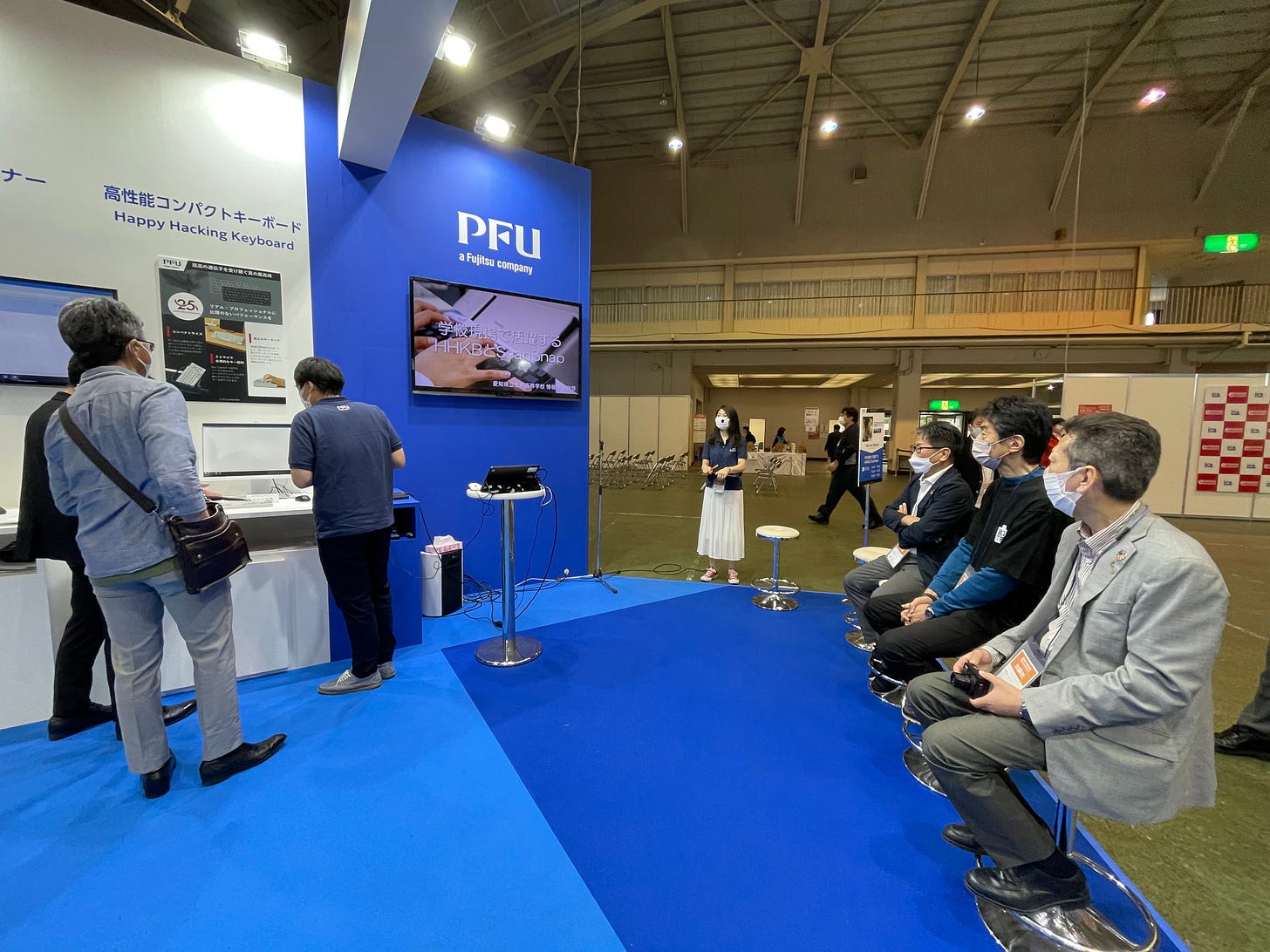 この写真はPFUブースのプレゼンコーナーです。椅子が6脚ほど用意されていて、講演中は後ろにも人だかりができていました。