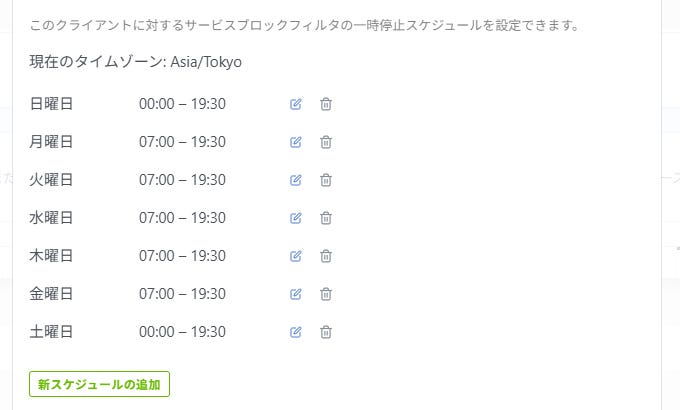 あまり複雑な設定はできませんが、例えば子どもが使うデバイスでyoutube.comの名前解決ができる時間帯を決めることができます。上の画面で言うと、平日は朝7時から夜7時半までアクセスできて、それ以外の時間帯だとそもそもYoutubeにつながらなくなります。