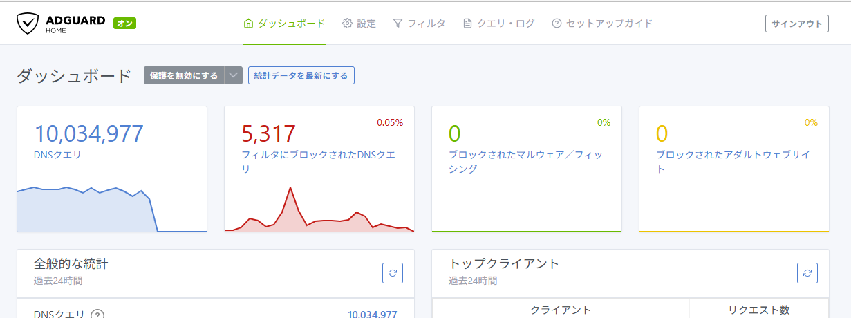 こちらがそのDNSサーバーのWeb管理画面のダッシュボードです。どれくらいの名前解決がされているのかが一目でわかります。また、AdGuardHomeにはデフォルトでアダルトサイトなどの有害サイトへのアクセスをフィルタリングしてくれる機能が有効になっているので、導入しただけでも十分効果が期待できます。