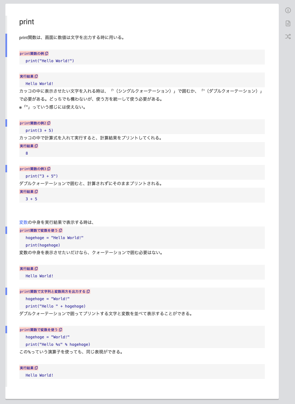 こんな感じにね。上の画像はPythonのPrint関数の解説ページです。専門家の方が見たら、「まだまだあれが足りん、これも書いてない」と思うかもしれませんが、僕なりに書いてみました。Scrapbox上で書いているので、加筆修正もすぐできます。